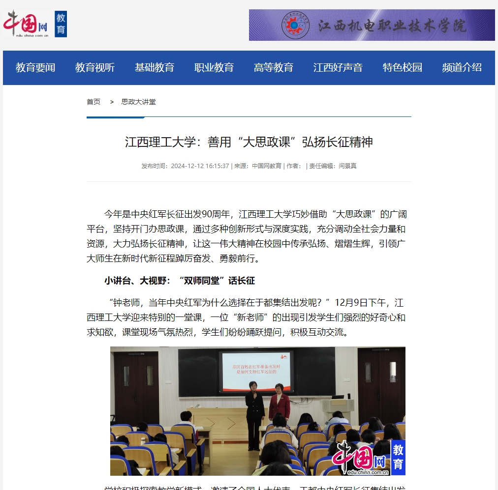 学校积极探索教学新模式,邀请了全国人大代表、于都中央红军长征集结出发历史博物馆纪念园管理办主任钟敏老师和马克思主义学院朱贤凌老师共同开展思政课“双师同堂”活动。钟敏老师凭借丰富的历史知识和生动的讲述技巧,把中央红军长征出发时那饱含悲壮色彩的场景与触动人心的故事栩栩如生地展现于学生眼前。她重点地讲述了苏区百姓如何毫无保留、竭尽所能地全力支援红军的动人情节,以及赣南子弟在长征漫漫征途中所作出的不可磨灭的卓越贡献。从百姓们省吃俭用为红军战士筹备粮食衣物,到青壮年义无反顾投身革命队伍踏上长征路;从军民齐心共克时艰的感人瞬间,到长征途中一个个彰显信念与情谊的经典事例,她皆细致入微地进行描绘。
