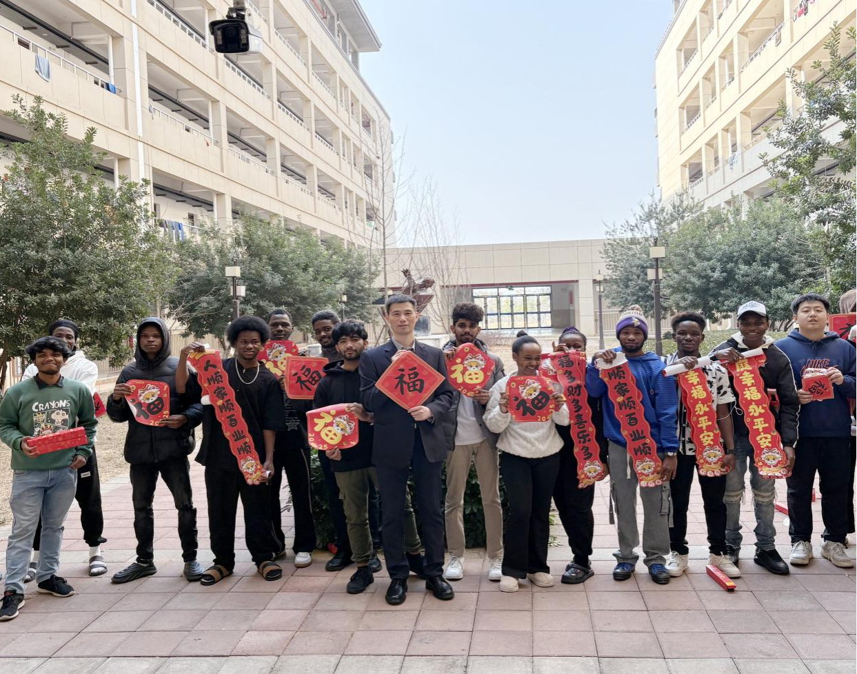 在贴春联活动现场,国际生们仔细比对位置,小心翼翼地涂抹胶水,再将春联稳稳地贴在门框上,将原本朴素的门框瞬间被装点得喜气洋洋。老师们还为国际生们送上写满祝福的“福”字,希望他们在新的一年里福气满满、福星高照。国际生们接过福字,纷纷用中文表达着“谢谢”,并兴奋地与“福”字合影留念。