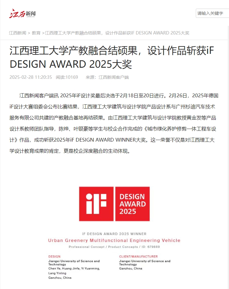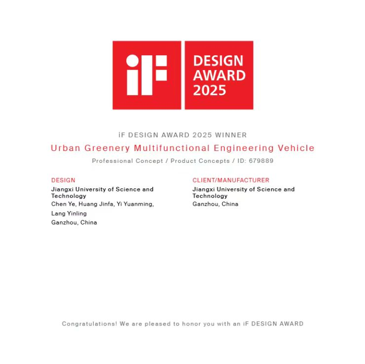 建筑与设计学院教授黄金发等产品设计系教师团队指导,陈烨、叶银豪等学生与校企合作完成的《城市绿化养护修剪一体工程车设计》作品,成功斩获2025年iF DESIGN AWARD WINNER大奖。这一荣誉不仅是对百家乐