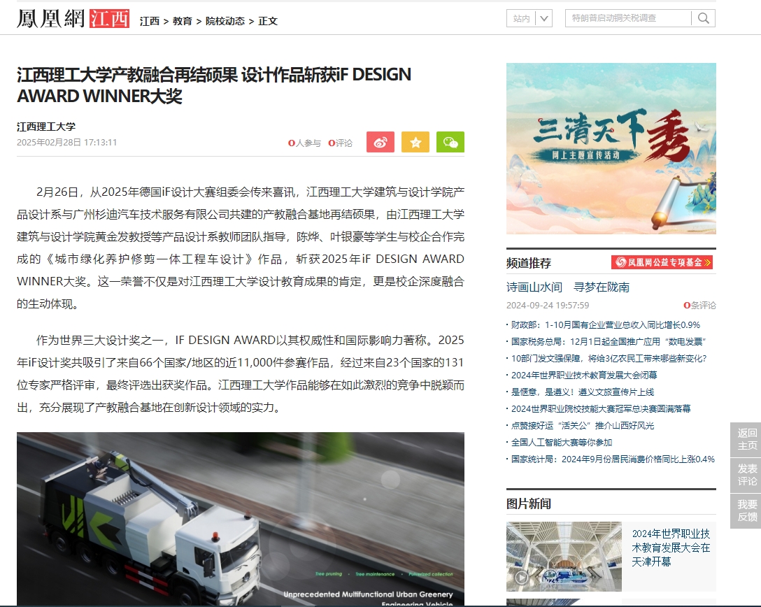 建筑与设计学院黄金发教授等产品设计系教师团队指导,陈烨、叶银豪等学生与校企合作完成的《城市绿化养护修剪一体工程车设计》作品,斩获2025年iF DESIGN AWARD WINNER大奖。这一荣誉不仅是对百家乐