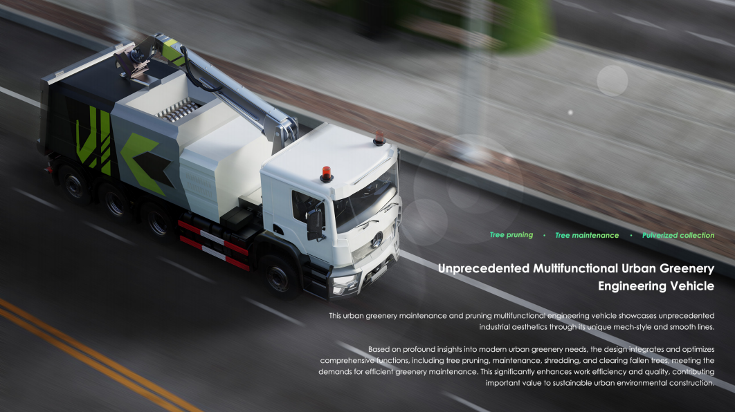 建筑与设计学院教师团队的指导下,学生深入参与企业实际项目,将课堂所学与行业需求紧密结合。此次获奖的作品《城市绿化养护修剪一体工程车设计》,以“机械风暴”为灵感,融合工业风格与机械元素,通过流畅的线条和独特的功能整合,展现了现代工业美学与实用性的完美结合。其前部设计借鉴了装甲车的坚固性与跑车的流线型,不仅优化了空气动力学性能,还赋予了车辆强烈的视觉冲击力。同时,机械臂与底盘的设计通过形式解构与重组,打破了传统工程车的刻板印象,为城市绿化维护提供了高效、创新的解决方案。
