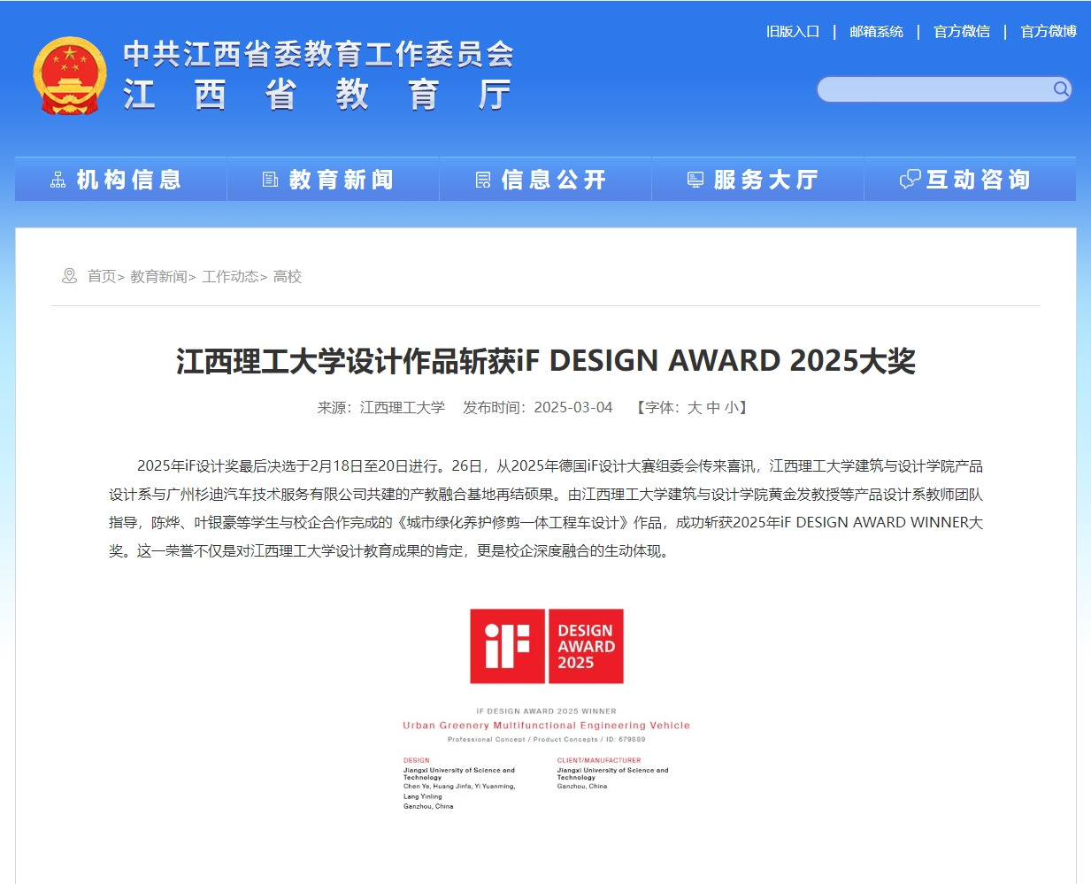 建筑与设计学院黄金发教授等产品设计系教师团队指导,陈烨、叶银豪等学生与校企合作完成的《城市绿化养护修剪一体工程车设计》作品,成功斩获2025年iF DESIGN AWARD WINNER大奖。这一荣誉不仅是对百家乐