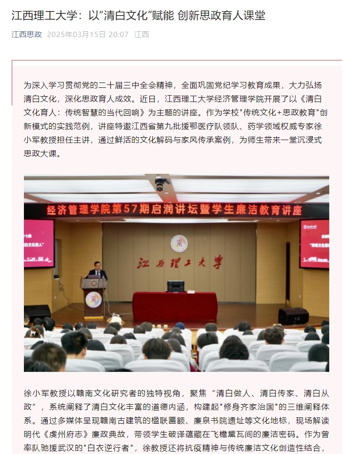 经济管理学院开展了以《清白文化育人:传统智慧的当代回响》为主题的讲座。作为学校"传统文化+思政教育"创新模式的实践范例,讲座特邀江西省第九批援鄂医疗队领队、药学领域权威专家徐小军教授担任主讲,通过鲜活的文化解码与家风传承案例,为师生带来一堂沉浸式思政大课。