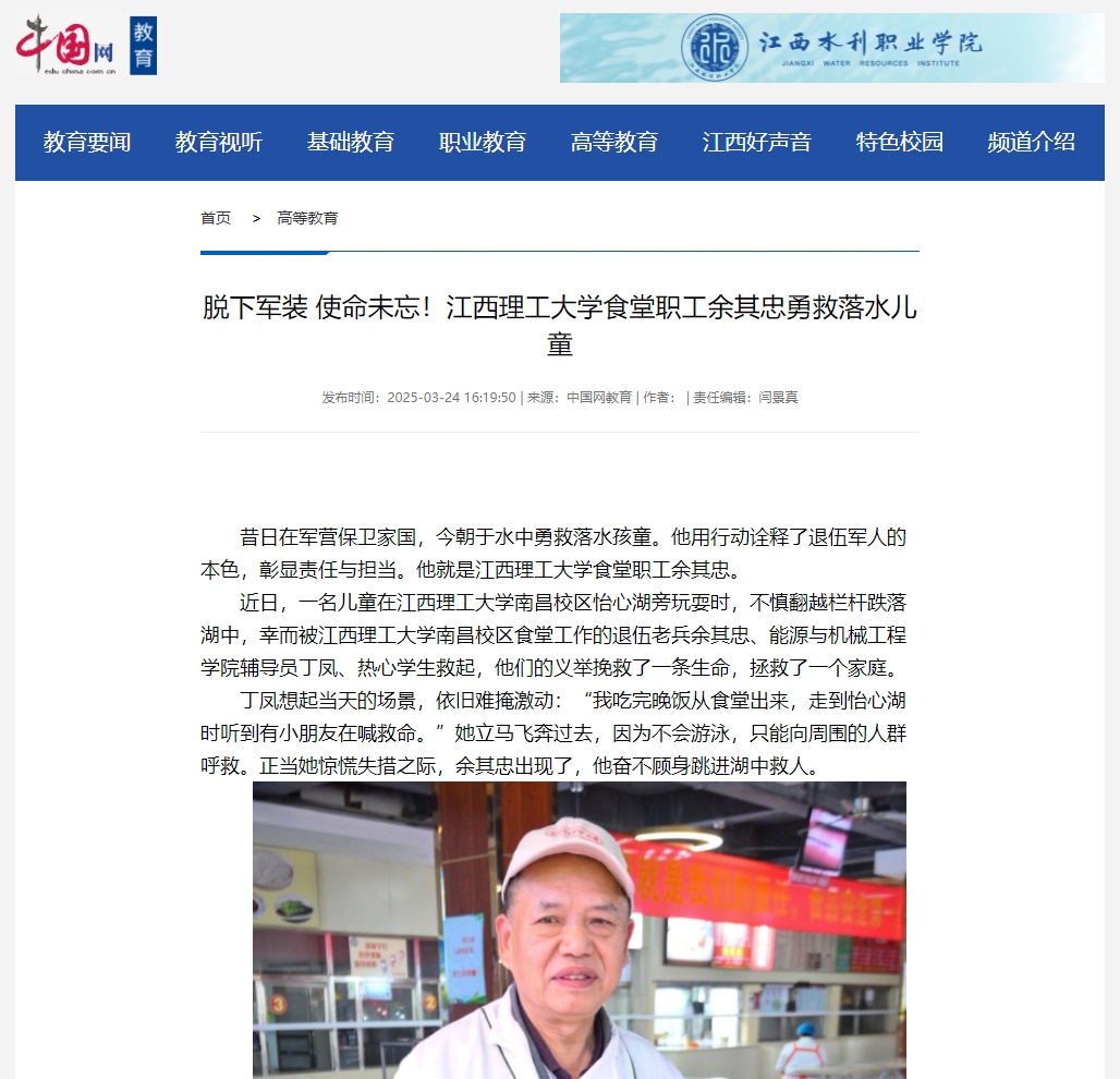 南昌校区食堂工作的退伍老兵余其忠、能源与机械工程学院辅导员丁凤、热心学生救起,他们的义举挽救了一条生命,拯救了一个家庭。