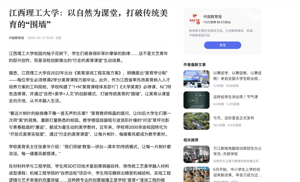 “看这片树叶的脉络像不像一首无声的乐章?”美育教师杨晶的提问,让00后大学生们第一次用“美”的视角,重新打量熟悉的校园。教学楼弧线窗框与波浪形叶缘的“对话”草坪光影与青春脸庞的“邂逅”,都成为最生动的美学教材。近年来,学校将2000余亩校园转化为“开放式美育实验室”,通过“行走的美育课堂”,让每片树叶、每缕春风都成为教学素材。