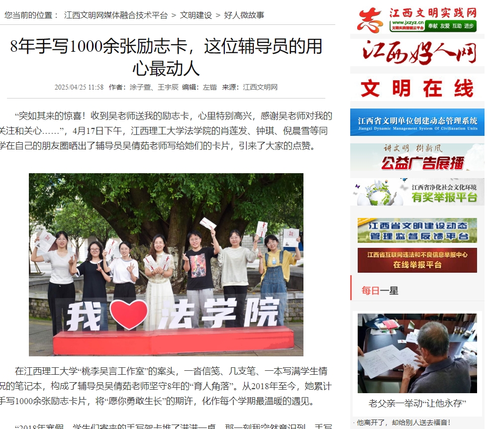 2015级学生简琴珍是第一批收到励志卡的学生之一,受到吴老师的影响,如今她也成为了南昌大学建筑与设计学院的一名辅导员。从收到卡片时的感动,到如今自己为学生写下寄语,她坦言:“吴老师用励志卡片教会我们,教育不仅是知识的传递,更是心与心的呼应。”