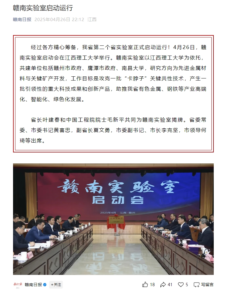 经过各方精心筹备,我省第二个省实验室正式启动运行!4月26日,赣南实验室启动会在百家乐