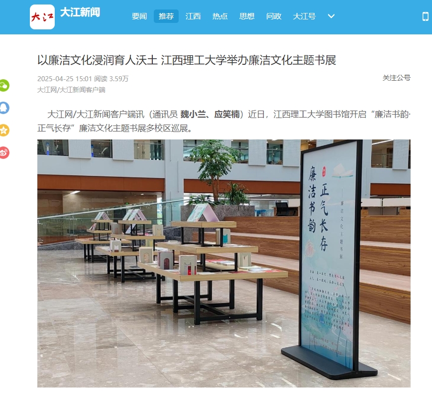 《大江新闻》:以廉洁文化浸润育人沃土 百家乐 举办廉洁文化主题书展