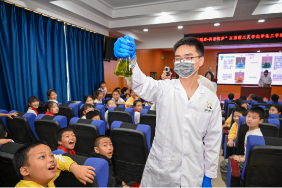 博士党员教师化身“科学魔法师”,用四大趣味实验点燃全场:李辉副教授的“红绿灯”揭示氧化还原反应的奥秘;徐慧博士的“彩虹雨”邂逅水油界面,演绎梦幻奇观;刘昆明副教授的“荧光棒的秘密”展示了化学光源的璀璨魅力……当刘遂军教授的“火山喷发”实验引发现场阵阵欢呼时,五年级学生卢蟠兴奋地说:“科学比动画片还神奇!我以后也要当科学家!”