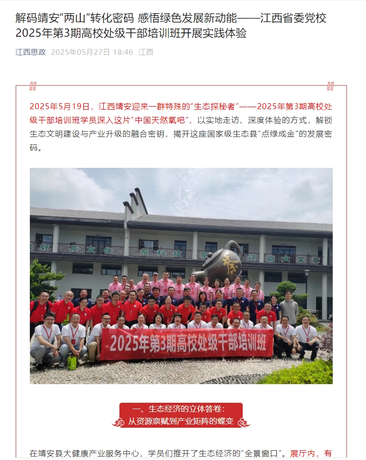 2025年5月19日,江西靖安迎来一群特殊的“生态探秘者”——2025年第3期高校处级干部培训班学员深入这片“中国天然氧吧”,以实地走访、深度体验的方式,解锁生态文明建设与产业升级的融合密钥,揭开这座国家级生态县“点绿成金”的发展密码。