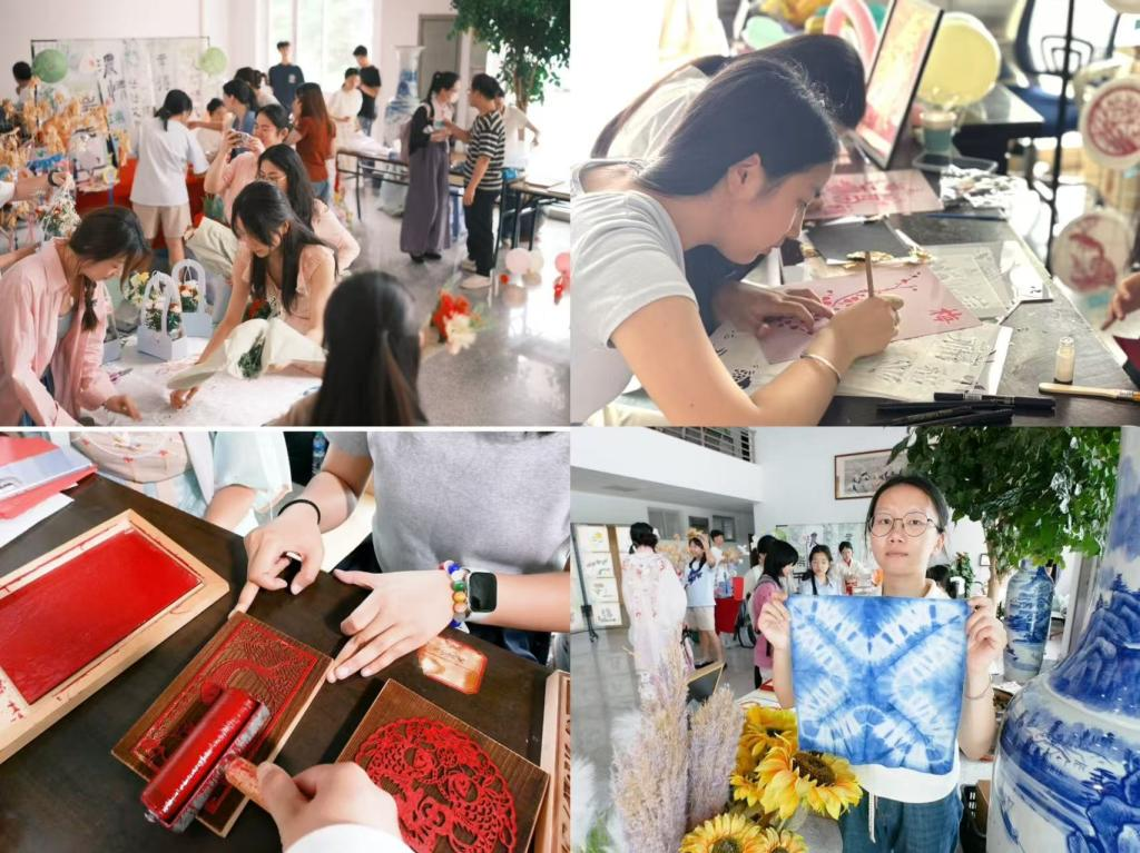 的同学们正在用手工劳作的方式亲身体会中国的传统技艺。他们一手固定宣纸边缘,一手拿着滚轮在哪吒主题样式的木板模型上匀速按压,一个个墨香淋漓的彩色小人便跃然纸上;金箔画展台上,同学们屏息凝神,用纤薄的镊子将金箔轻轻贴在画板上,金箔在同学们的指尖上绽放出绮丽炫目的色彩,在阳光的照射下熠熠生辉;扎染区里,洁白的布料经过同学们的捆扎和植物染料的浸润,绽放出独一无二的花纹;衍纸作品展示栏更是将“十二生肖”的灵动、“梅兰竹菊”的雅致和人物形象的韵味呈现在大家眼前,动物活灵活现、竹叶错落有致、花瓣层层叠叠、人物生动传神,每一件作品都凝聚着大家对传统文化的热爱。同学们在创作的过程中以经典文化符号为切入点,融入了喜闻乐见的现代元素,既有经典的传承,又有时代的新意,是文化传承与创新实践的生动结合。