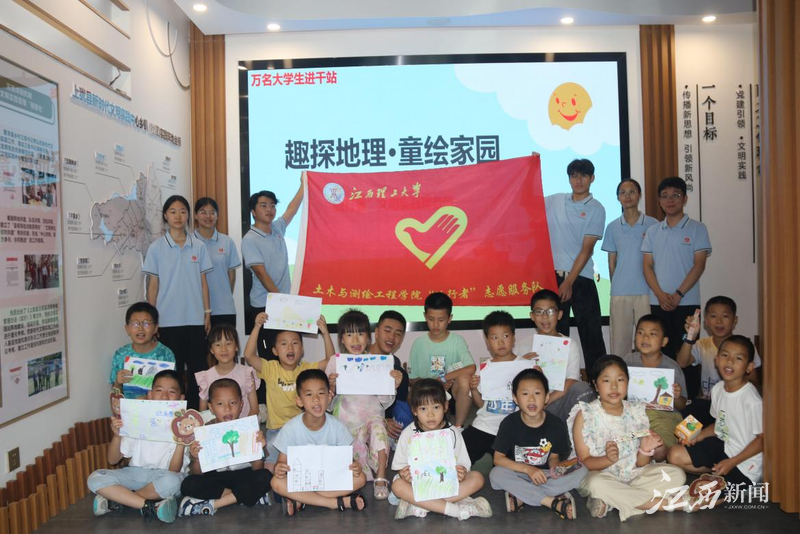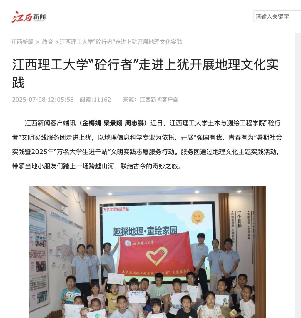 土木与测绘工程学院“砼行者”文明实践服务团走进上犹,以地理信息科学专业为依托,开展“强国有我、青春有为”暑期社会实践暨2025年“万名大学生进千站”文明实践志愿服务行动。服务团通过地理文化主题实践活动,带领当地小朋友们踏上一场跨越山河、联结古今的奇妙之旅。