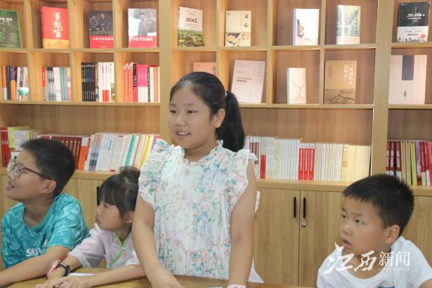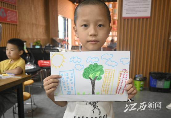 “思想大爆炸”创作环节,队员周小璐轻声引导:“想想家乡最让你骄傲的是什么?把它画下来吧。”小朋友们托腮沉思片刻,便专注创作。不一会儿,一幅幅充满温度的家乡画卷诞生了:有的画上了古朴的客家围屋,屋檐下挂着金黄的玉米;有的描绘了清澈的上犹江,江面上漂着小渔船;还有的把陡水湖景区的摩天轮画成了彩色,旁边歪歪扭扭写着“我的家乡最美”。