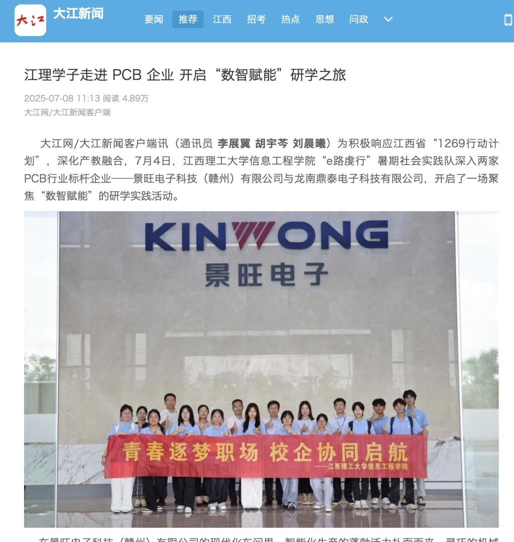 信息工程学院“e路虔行”暑期社会实践队深入两家PCB行业标杆企业——景旺电子科技(赣州)有限公司与龙南鼎泰电子科技有限公司,开启了一场聚焦“数智赋能”的研学实践活动。