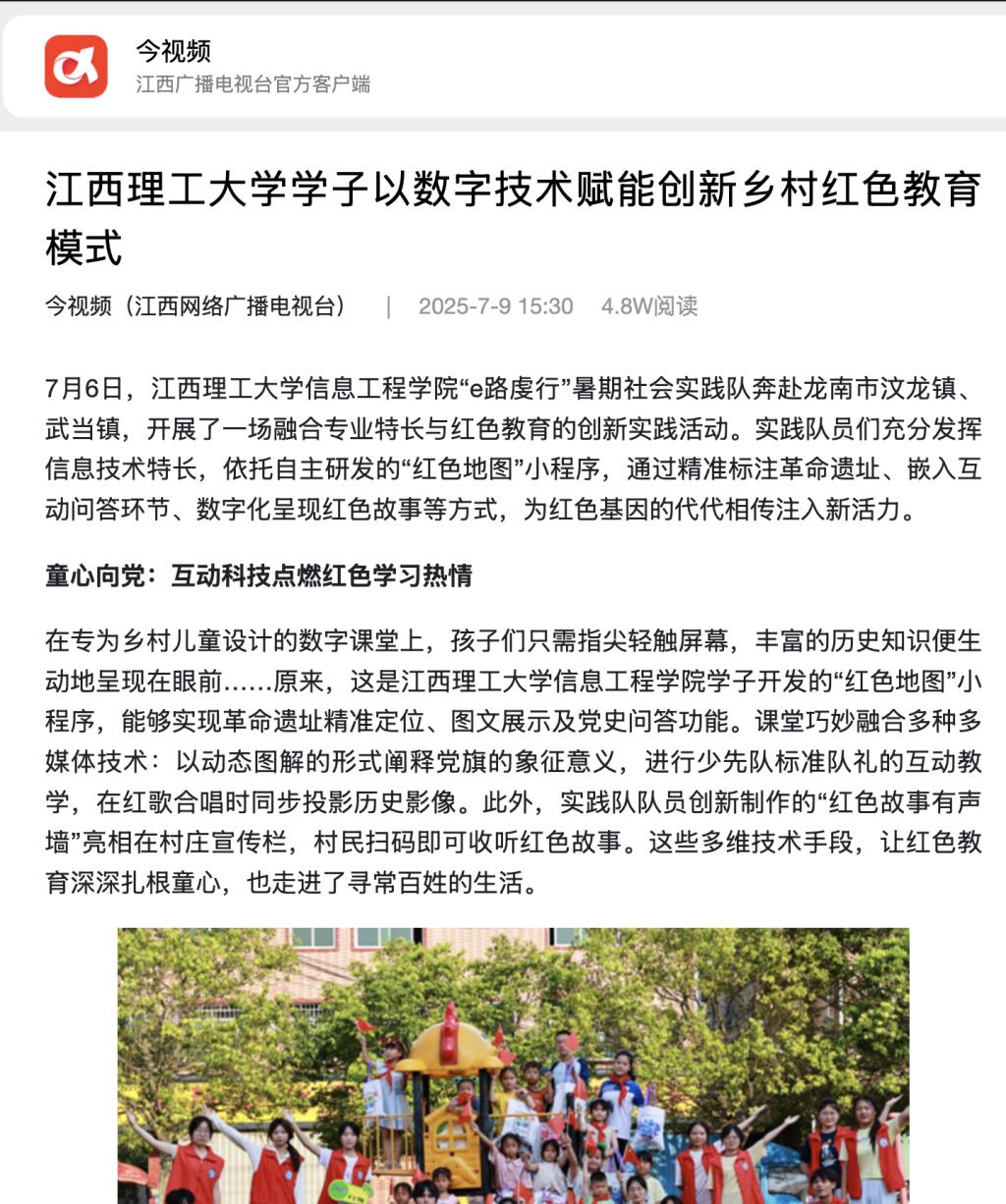 信息工程学院的学子们凭借青春智慧,将专业知识转化为服务社会的实践成果,为乡村红色教育注入了全新的“数字动能”。他们用实际行动证明,科技不仅能连接未来,更能有效守护和传承历史。在红色基因与数字创新的融合滋养下,当地的革命历史焕发出新的时代光彩。乡村儿童与老人在共同的学习体验中,实现了红色精神的代际传递,为培育能够堪当民族复兴重任的时代新人,贡献了高校学子的创新力量。(刘晨曦 胡宇芩)