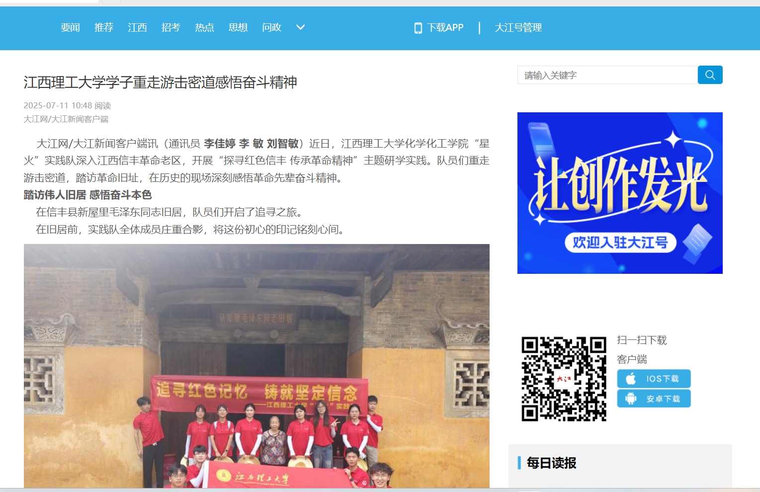 化学化工学院“星火”实践队深入江西信丰革命老区,开展“探寻红色信丰 传承革命精神”主题研学实践。队员们重走游击密道,踏访革命旧址,在历史的现场深刻感悟革命先辈奋斗精神。