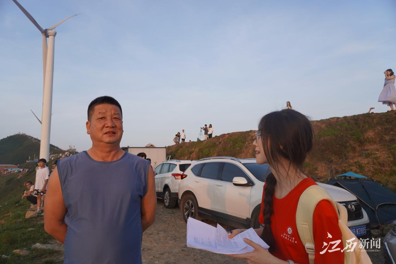 于草山之巅,团队成员手持问卷和访谈提纲,穿梭在陆续抵达的游客之间。调研中,游客们对草山风光的赞美不绝于耳:“日出太震撼了,这是我第一次看日出!”“这空气,值了!城市里可呼吸不到!”