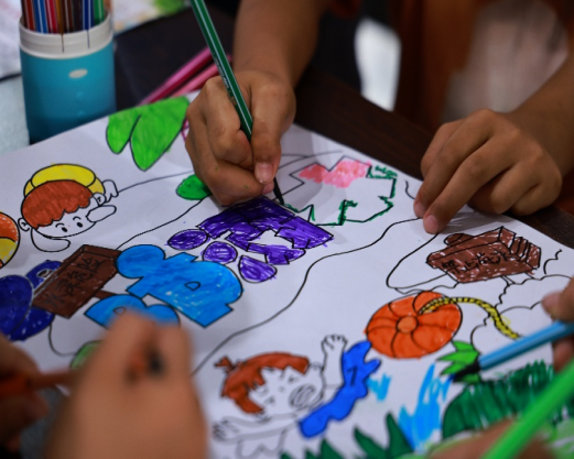 ▲孩子们为防溺水海报填色涂鸦 摄影丨李展翼