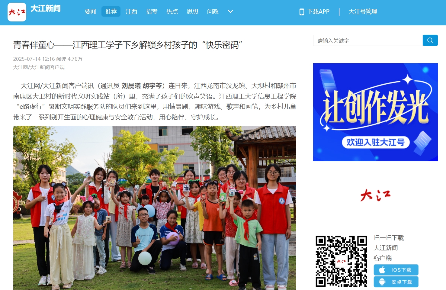 信息工程学院“e路虔行”暑期文明实践服务队的队员们来到这里,用情景剧、趣味游戏、歌声和画笔,为乡村儿童带来了一系列别开生面的心理健康与安全教育活动,用心陪伴,守护成长。