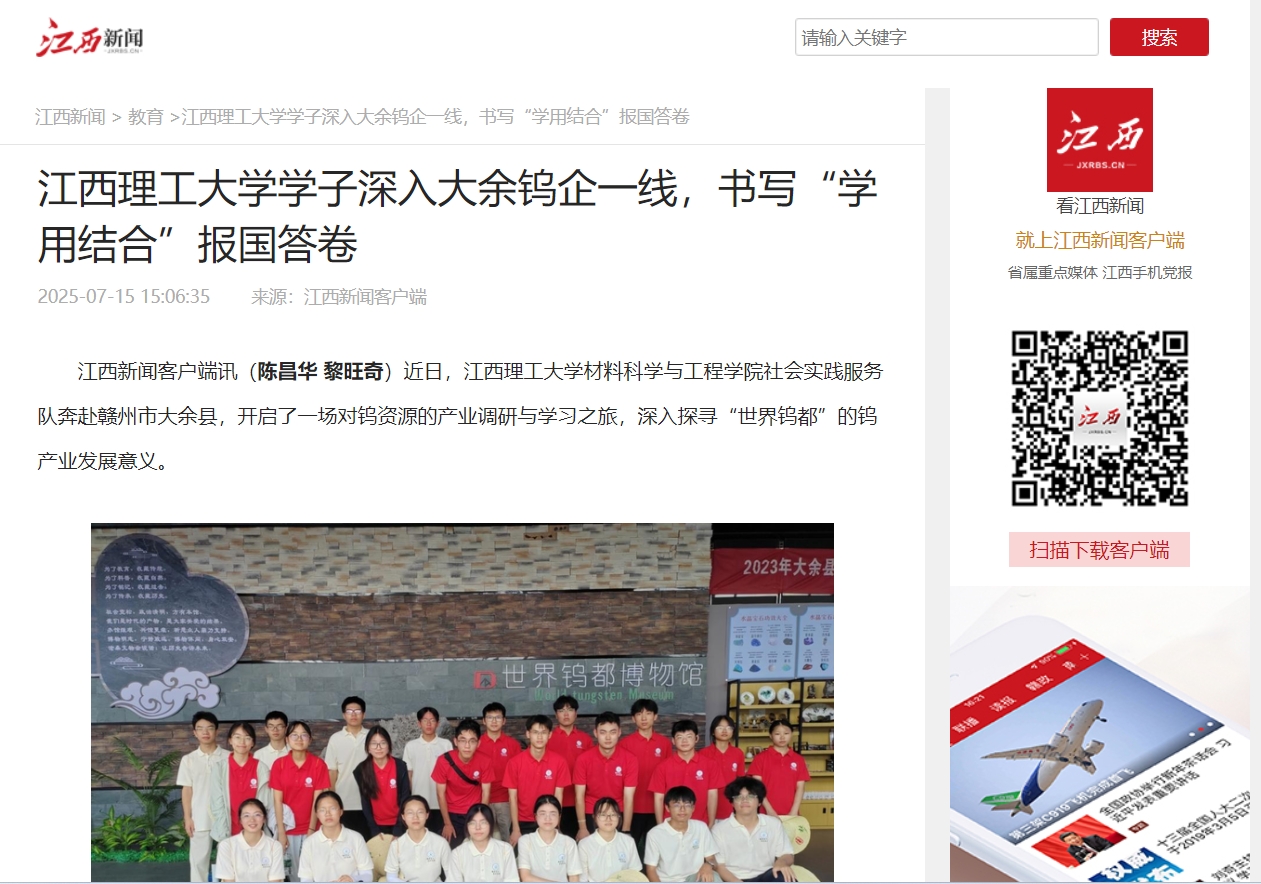 材料科学与工程学院社会实践服务队奔赴赣州市大余县,开启了一场对钨资源的产业调研与学习之旅,深入探寻“世界钨都”的钨产业发展意义。
