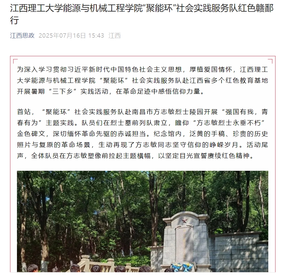 能源与机械工程学院“聚能环”社会实践服务队赴江西省多个红色教育基地开展暑期“三下乡”实践活动,在革命足迹中感悟信仰力量。