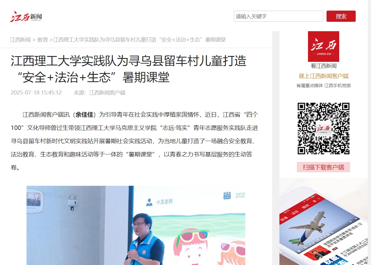 马克思主义学院“志远·笃实”青年志愿服务实践队走进寻乌县留车村新时代文明实践站开展暑期社会实践活动,为当地儿童打造了一场融合安全教育、法治教育、生态教育和趣味活动等于一体的“暑期课堂”,以青春之力书写基层服务的生动答卷。