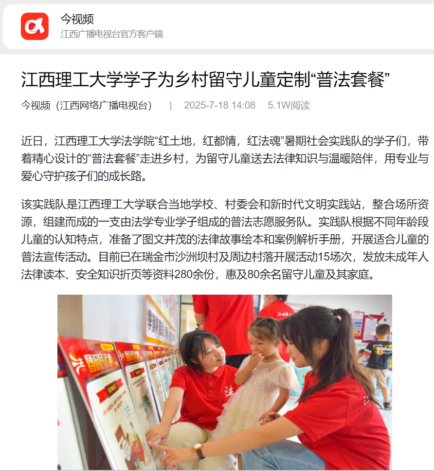 法学院“红土地,红都情,红法魂”暑期社会实践队的学子们,带着精心设计的“普法套餐”走进乡村,为留守儿童送去法律知识与温暖陪伴,用专业与爱心守护孩子们的成长路。