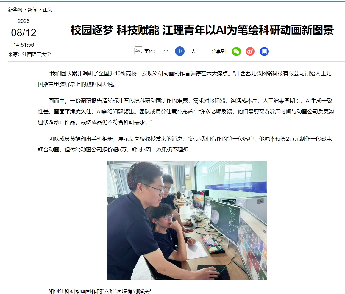 成果很快显现。团队与某生物实验室合作的多光谱光反馈同步校准动画,传统制作需2周,而通过AI平台仅3天完成,成本从8000元降至3600元。“客户看到成片时,直接追加了5个订单。”徐佳慧笑着回忆。市场数据印证了突破:上线不到一年,团队服务客户超110家,年营收突破300万元。“艺启科影”在各个社交账号上发布的科研动画也屡屡受到好评,实现品牌曝光与产品引流转化。