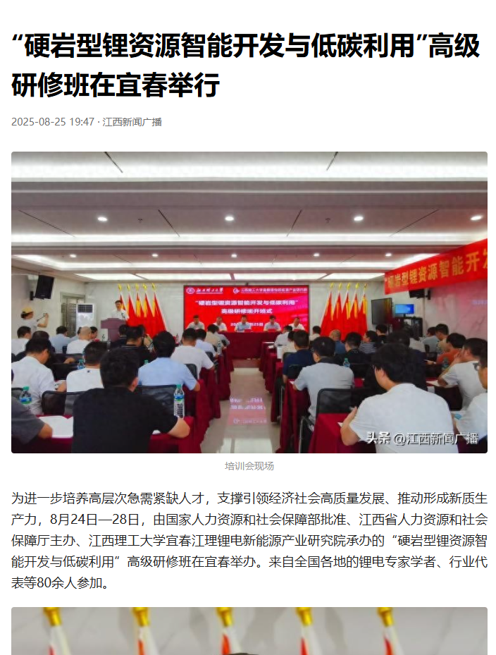 宜春江理锂电新能源产业研究院承办的“硬岩型锂资源智能开发与低碳利用”高级研修班在宜春举办。来自全国各地的锂电专家学者、行业代表等80余人参加。