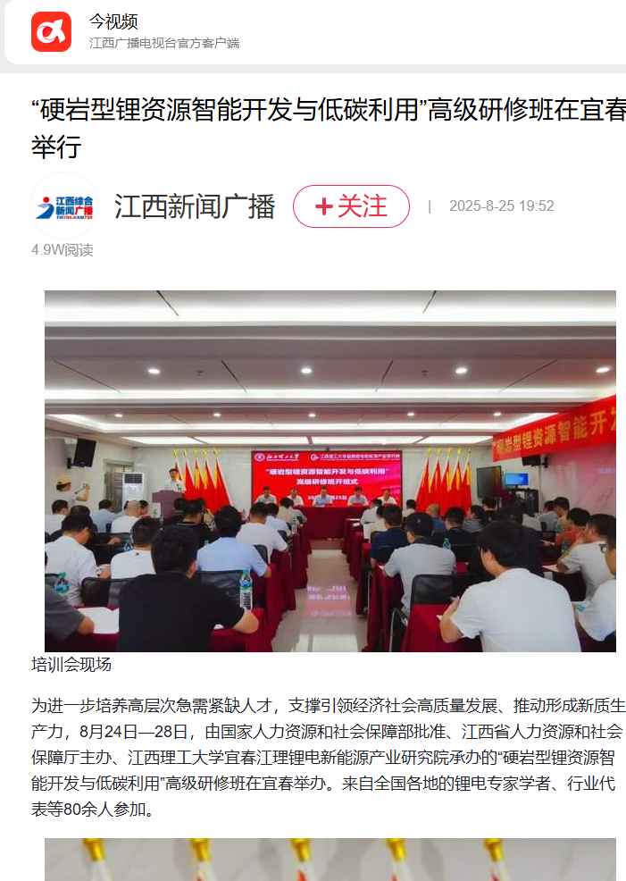 宜春江理锂电新能源产业研究院承办的“硬岩型锂资源智能开发与低碳利用”高级研修班在宜春举办。来自全国各地的锂电专家学者、行业代表等80余人参加。