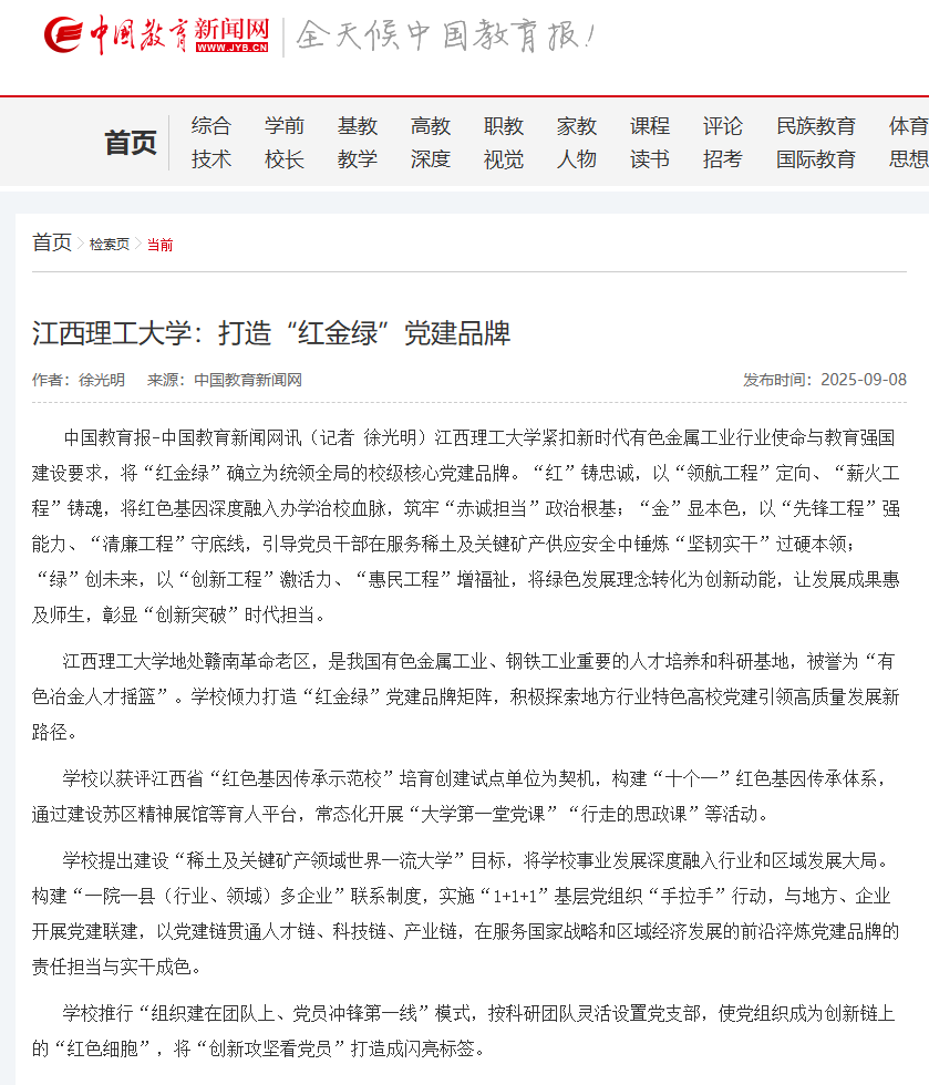 紧扣新时代有色金属工业行业使命与教育强国建设要求,将“红金绿”确立为统领全局的校级核心党建品牌。“红”铸忠诚,以“领航工程”定向、“薪火工程”铸魂,将红色基因深度融入办学治校血脉,筑牢“赤诚担当”政治根基;“金”显本色,以“先锋工程”强能力、“清廉工程”守底线,引导党员干部在服务稀土及关键矿产供应安全中锤炼“坚韧实干”过硬本领;“绿”创未来,以“创新工程”激活力、“惠民工程”增福祉,将绿色发展理念转化为创新动能,让发展成果惠及师生,彰显“创新突破”时代担当。
