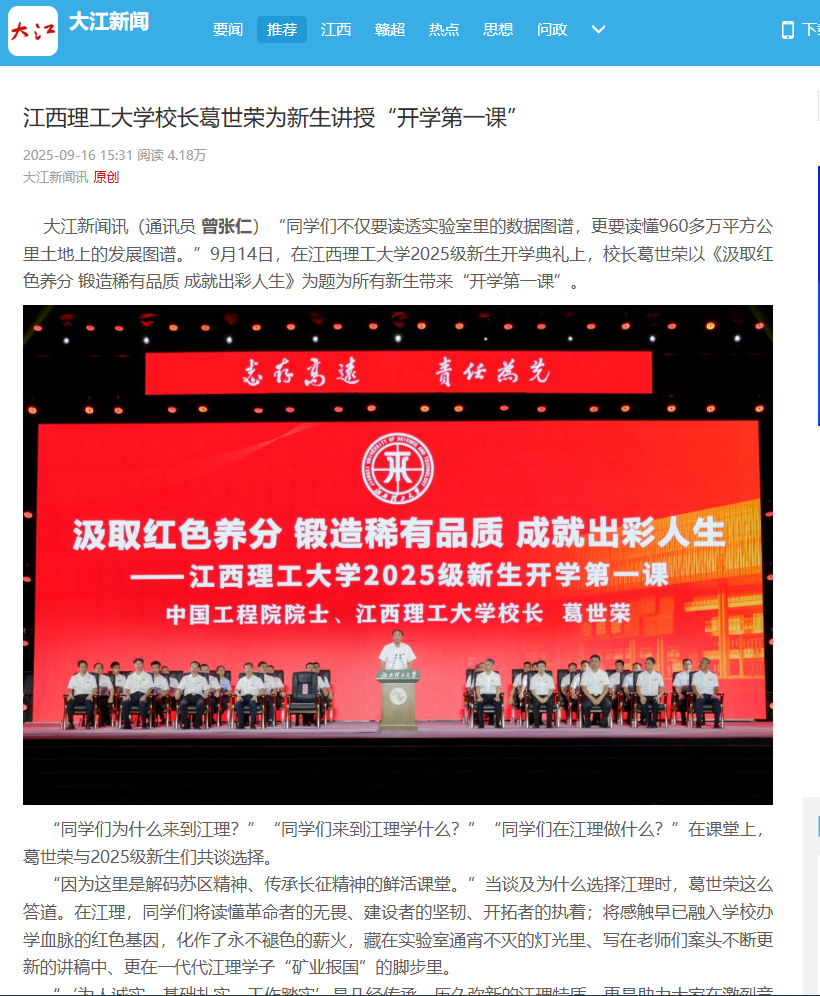 葛世荣称,时代呼唤青年学子以创新思维突破技术壁垒,用前沿探索引领产业升级,同学们在江理要勇于创新、敢于创业、善于创意。葛世荣希望同学们在国情认知上做“勘探者”,在实践历练中当“淬火钢”,在服务基层和人民中成“高强钢”,像稀土永磁体那样牢牢吸附在服务基层、造福人民的火热实践中,在德智体美劳的锻造中,成长为有温度、有韧性、有光芒的江理人。