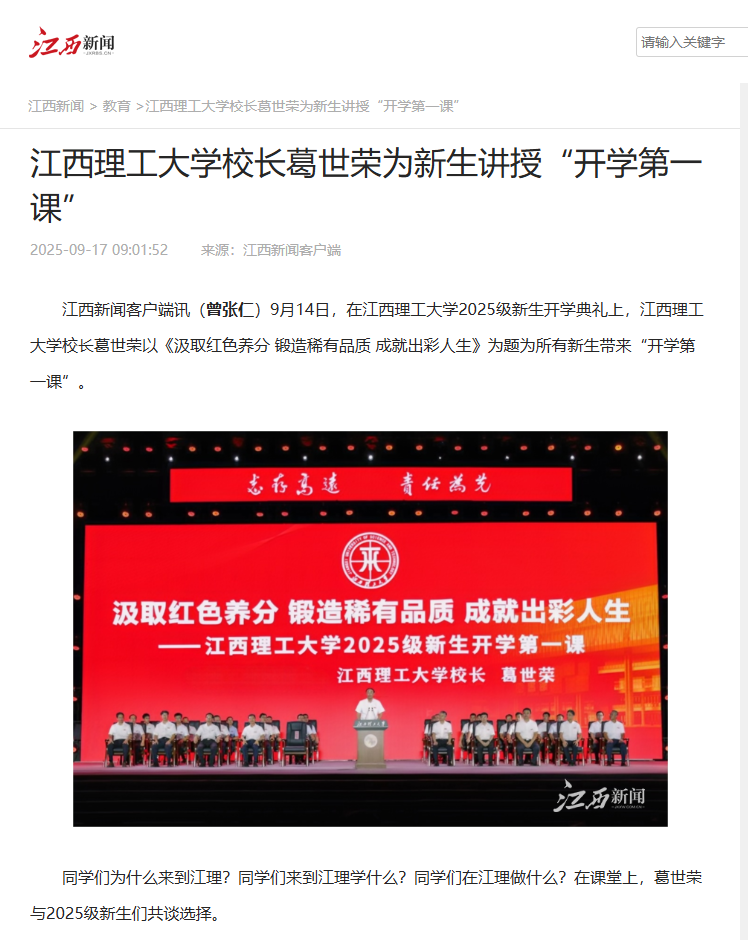 葛世荣称,时代呼唤青年学子以创新思维突破技术壁垒,用前沿探索引领产业升级,同学们在江理要勇于创新、敢于创业、善于创意。葛世荣希望同学们在国情认知上做“勘探者”,在实践历练中当“淬火钢”,在服务基层和人民中成“高强钢”,像稀土永磁体那样牢牢吸附在服务基层、造福人民的火热实践中,在德智体美劳的锻造中,成长为有温度、有韧性、有光芒的江理人。