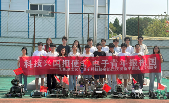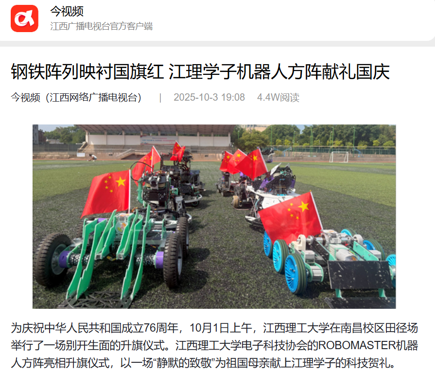 电子科技协会的ROBOMASTER机器人方阵亮相升旗仪式,以一场“静默的致敬”为祖国母亲献上江理学子的科技贺礼。