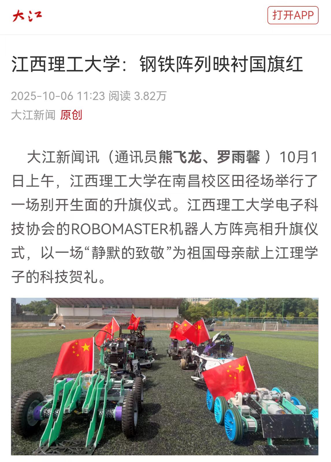 电子科技协会的ROBOMASTER机器人方阵亮相升旗仪式,以一场“静默的致敬”为祖国母亲献上江理学子的科技贺礼。