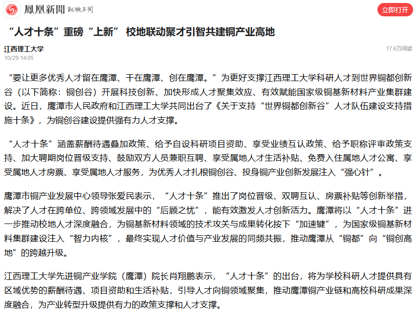 鹰潭市铜产业发展中心领导张爱民表示,“人才十条”推出了岗位晋级、双聘互认、房票补贴等创新举措,解决了人才在跨单位、跨领域发展中的“后顾之忧”,能有效激发人才创新活力。鹰潭将以“人才十条”进一步推动校地人才深度融合,为铜基新材料领域的技术攻关与成果转化按下“加速键”,为国家级铜基新材料集群建设注入“智力内核”,最终实现人才价值与产业发展的同频共振,推动鹰潭从“铜都”向“铜创高地”的跨越升级。