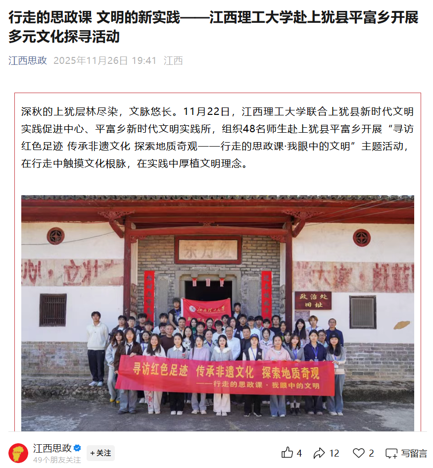 联合上犹县新时代文明实践促进中心、平富乡新时代文明实践所,组织48名师生赴上犹县平富乡开展“寻访红色足迹 传承非遗文化 探索地质奇观——行走的思政课·我眼中的文明”主题活动,在行走中触摸文化根脉,在实践中厚植文明理念。