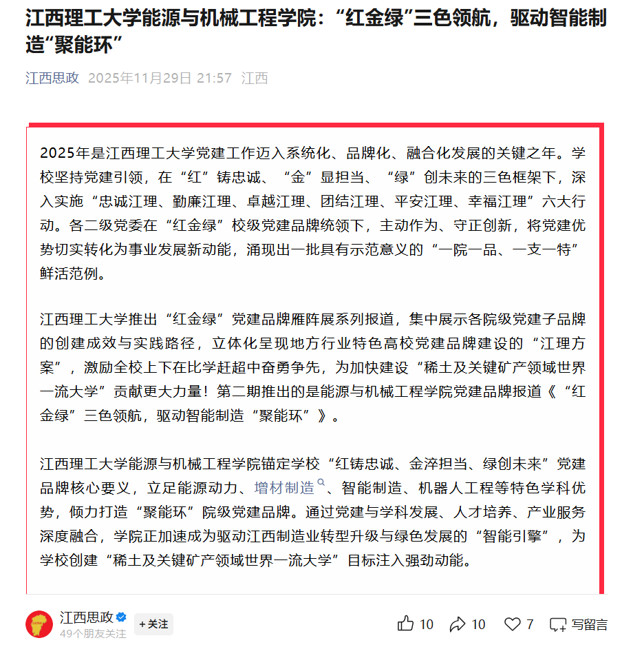 推出“红金绿”党建品牌雁阵展系列报道,集中展示各院级党建子品牌的创建成效与实践路径,立体化呈现地方行业特色高校党建品牌建设的“江理方案”,激励全校上下在比学赶超中奋勇争先,为加快建设“稀土及关键矿产领域世界一流大学”贡献更大力量!第二期推出的是能源与机械工程学院党建品牌报道《“红金绿”三色领航,驱动智能制造“聚能环”》。