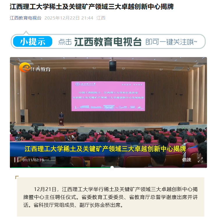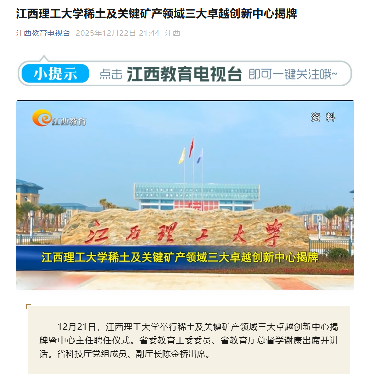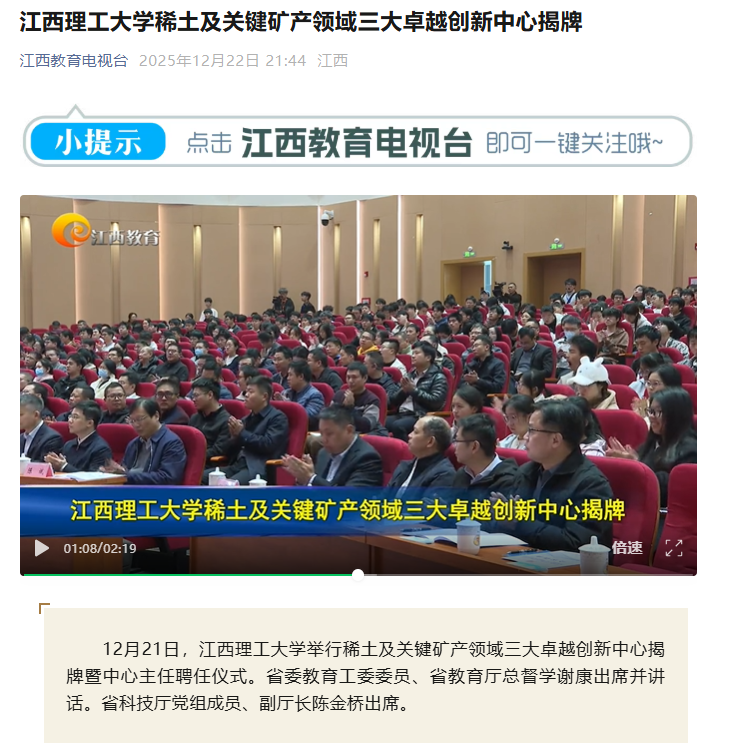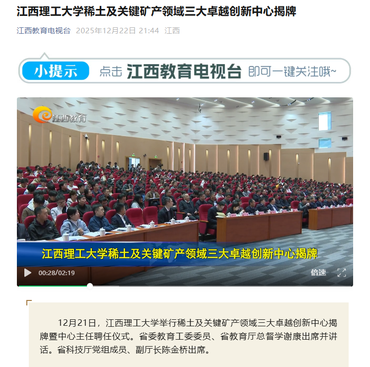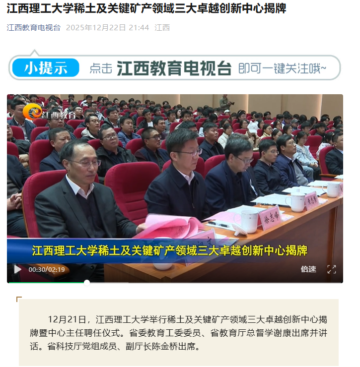 12月21日,百家乐 举行稀土及关键矿产领域三大卓越创新中心揭牌暨中心主任聘任仪式。省委教育工委委员、省教育厅总督学谢康出席并讲话。省科技厅党组成员、副厅长陈金桥出席。