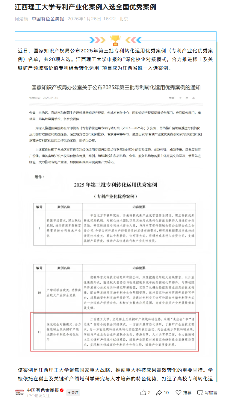 申报的“深化校企对接模式,合力推进稀土及关键矿产领域高价值专利组合转化运用”项目成为江西省唯一入选案例。