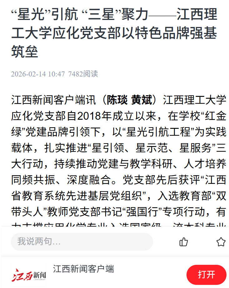 从实验室到生产线,从大学校园到田间地头,应化党支部立足新起点,持续深化“双带头人”培育工程,做优做强“星光引航”党建品牌,进一步推动党建工作与人才培养、科学研究、社会服务有机融合、同向发力,为学校“双一流”建设和江西高质量发展贡献坚实的基层力量。