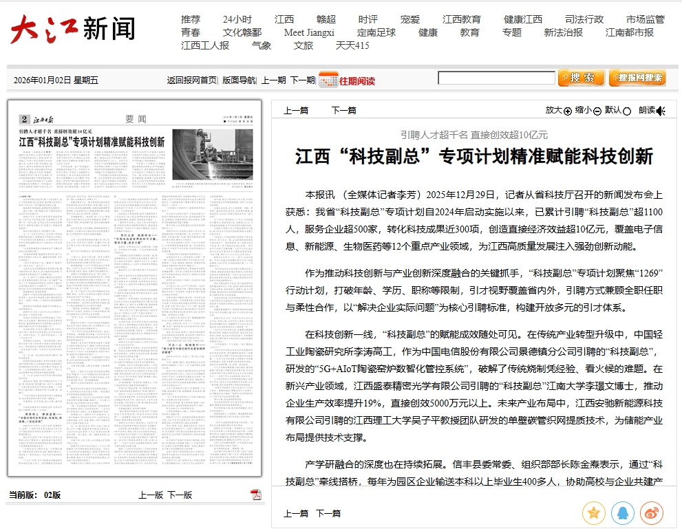 本报讯 (全媒体记者李芳)2025年12月29日,记者从省科技厅召开的新闻发布会上获悉:我省“科技副总”专项计划自2024年启动实施以来,已累计引聘“科技副总”超1100人,服务企业超500家,转化科技成果近300项,创造直接经济效益超10亿元,覆盖电子信息、新能源、生物医药等12个重点产业领域,为江西高质量发展注入强劲创新动能。