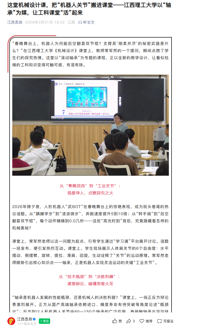 课堂上,常军然老师以这一问题为起点,引导学生通过“学习通”平台展开讨论。话题一经发布,便引发热烈互动。课堂上,学生现场展示人体肩关节的6个自由度:水平摆动、侧摆臂、旋转、提拉、滑肩、回旋,生动诠释了“关节”的运动原理。常军然老师顺势引出核心知识点——轴承,正是机器人实现灵活运动的关键“工业关节”。