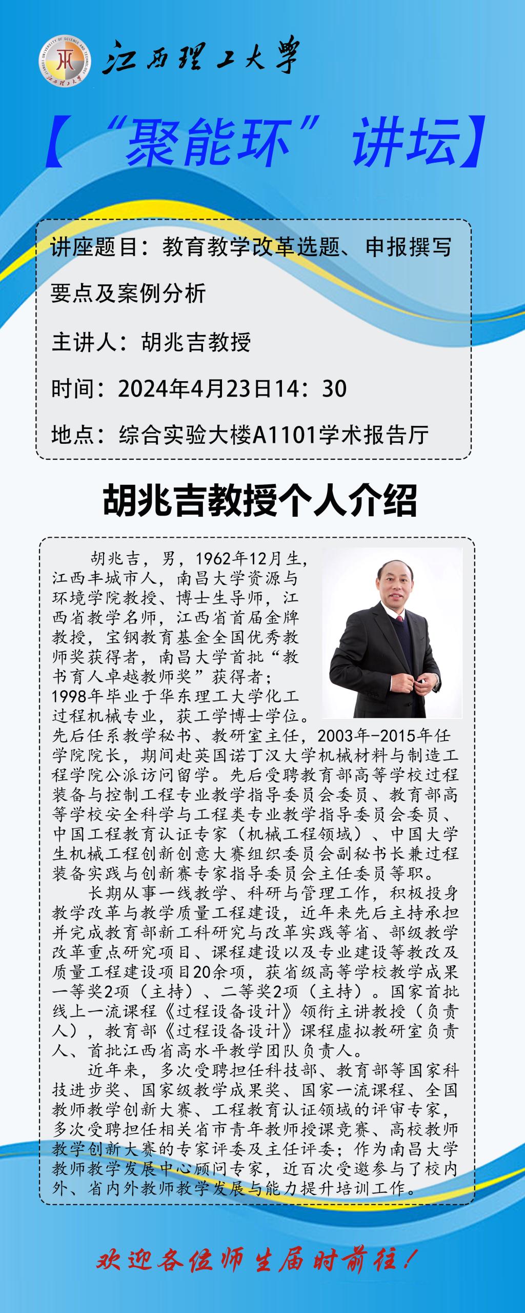 胡兆吉,男,1962年12月生,江西丰城市人,南昌大学资源与环境学院教授、博士生导师,江西省教学名师,江西省首届金牌教授,宝钢教育基金全国优秀教师奖获得者,南昌大学首批“教书育人卓越教师奖”获得者;1998年毕业于华东理工大学化工过程机械专业,获工学博士学位。先后任系教学秘书、教研室主任,2003年-2015年任学院院长,期间赴英国诺丁汉大学机械材料与制造工程学院公派访问留学。先后受聘教育部高等学校过程装备与控制工程专业教学指导委员会委员、教育部高等学校安全科学与工程类专业教学指导委员会委员、中国工程教育认证专家(机械工程领域)、中国大学生机械工程创新创意大赛组织委员会副秘书长兼过程装备实践与创新赛专家指导委员会主任委员等职。