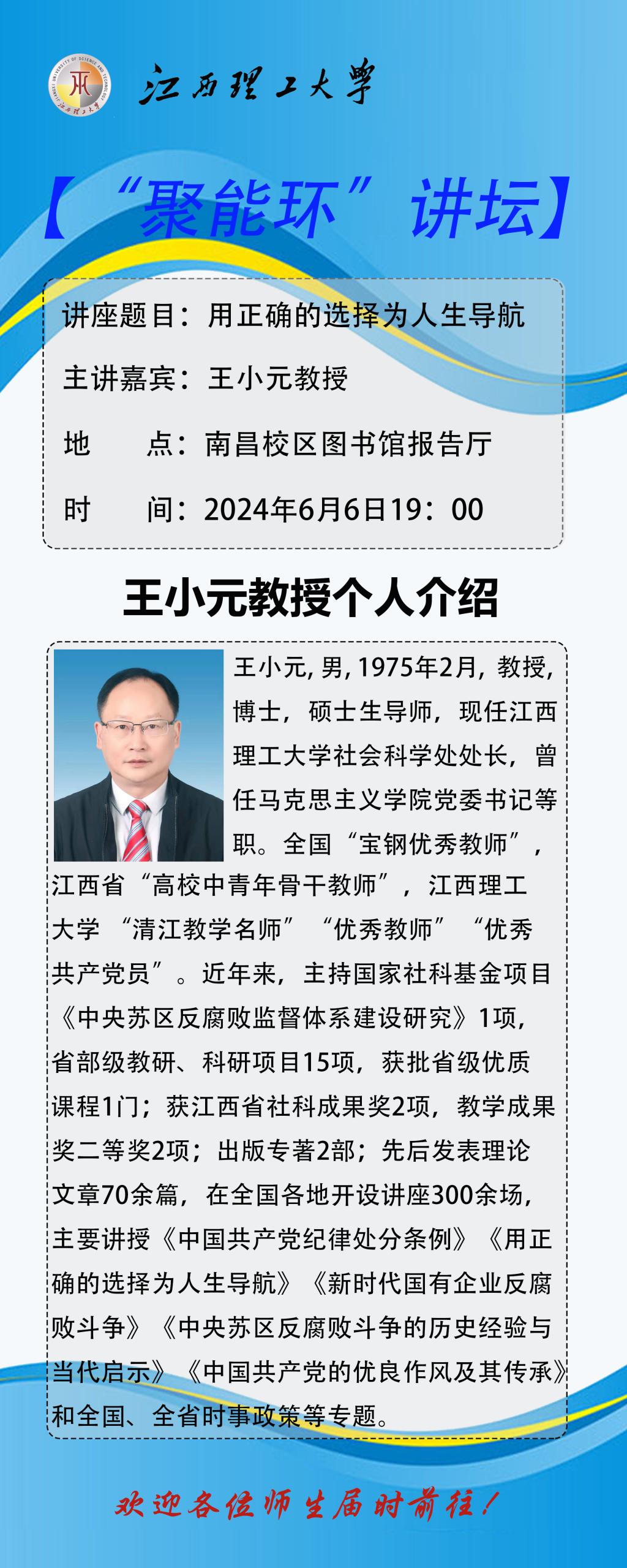 王小元,男,1975年2月,教授,博士,硕士生导师,现任百家乐 社会科学处处长,曾任马克思主义学院党委书记等职。全国“宝钢优秀教师”,江西省“高校中青年骨干教师”,百家乐 “清江教学名师”“优秀教师”“优秀共产党员”。近年来,主持国家社科基金项目《中央苏区反腐败监督体系建设研究》1项,省部级教研、科研项目15项,获批省级优质课程1门;获江西省社科成果奖2项,教学成果奖二等奖2项;出版专著2部;先后发表理论文章70余篇,在全国各地开设讲座300余场,主要讲授《中国共产党纪律处分条例》《用正确的选择为人生导航》《新时代国有企业反腐败斗争》《中央苏区反腐败斗争的历史经验与当代启示》《中国共产党的优良作风及其传承》和全国、全省时事政策等专题。