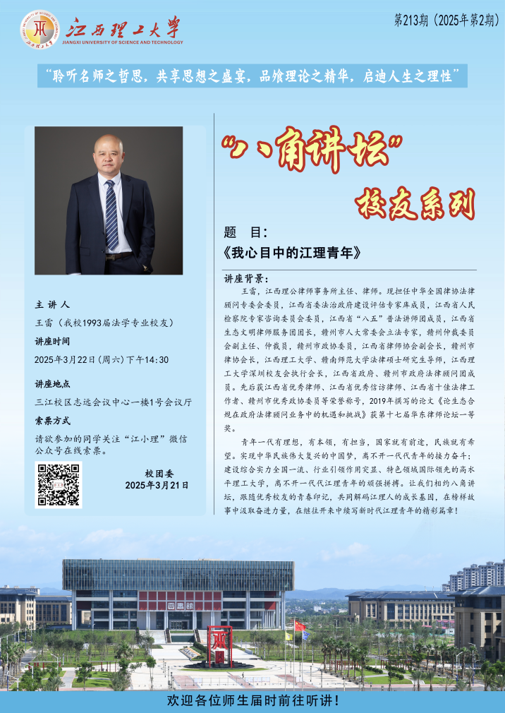 青年一代有理想,有本领,有担当,国家就有前途,民族就有希望。实现中华民族伟大复兴的中国梦,离不开一代代青年的接力奋斗;建设综合实力全国一流、行业引领作用突显、特色领域国际领先的高水平理工大学,离不开一代代江理青年的顽强拼搏。让我们相约八角讲坛,跟随优秀校友的青春印记,共同解码江理人的成长基因,在榜样故事中汲取奋进力量,在继往开来中续写新时代江理青年的精彩篇章!