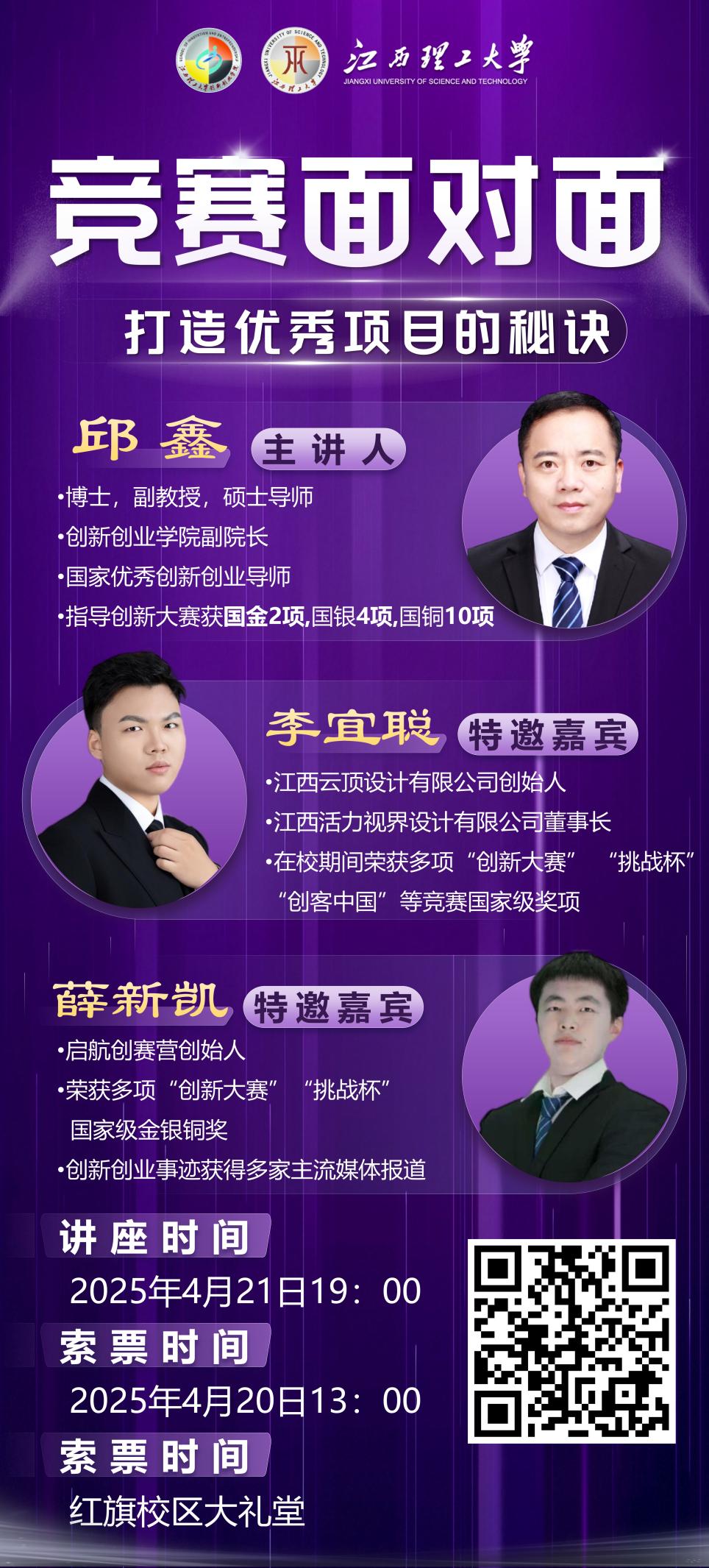 创新创业学院副院长邱鑫将携两位2024年创新大赛国赛金/银获奖团队项目负责人/骨干成员分享参赛经验,并现场与听众互动答疑。