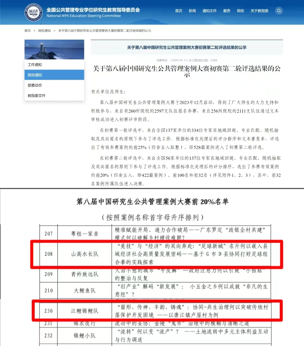 其中,“我们这队”的参赛案例《阴云漫起,曙光乍现,且看潭头如何点“硒”成金 ——革命老区于都县梓山镇潭头村高质量发展蝶变记》和“治水兴城队”的参赛案例《运动式治理与创造性治理:城市污水治理何以“长治久清”?——以中央环保督察背景下南昌市污水治理为例》入围第八届中国研究生公共管理案例大赛前25%;“山高水长队”的参赛案例《“竞技”与“经济”的双向奔赴:“足球新城”名片何以嵌入县域经济社会高质量发展密码——基于G市D县协同打好足球组合拳的实践探索》和“江鲤锦鲤队”的参赛案例《“留形、传神、丰韵、铸魂”:协同-共生治理何以突破传统村落保护开发困境——以唐江镇卢屋村为例》入围前20%。