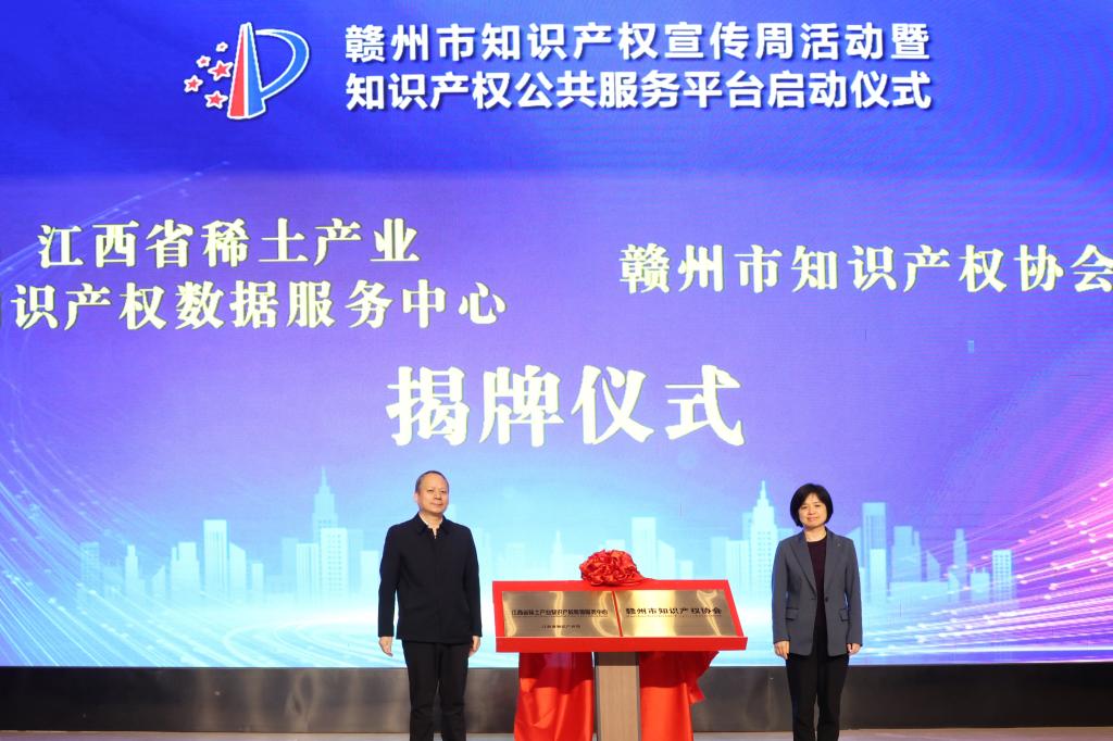 在赣州市知识产权宣传周活动暨知识产权公共服务平台启动仪式上,张骅、唐云志共同为赣州市知识产权协会揭牌。