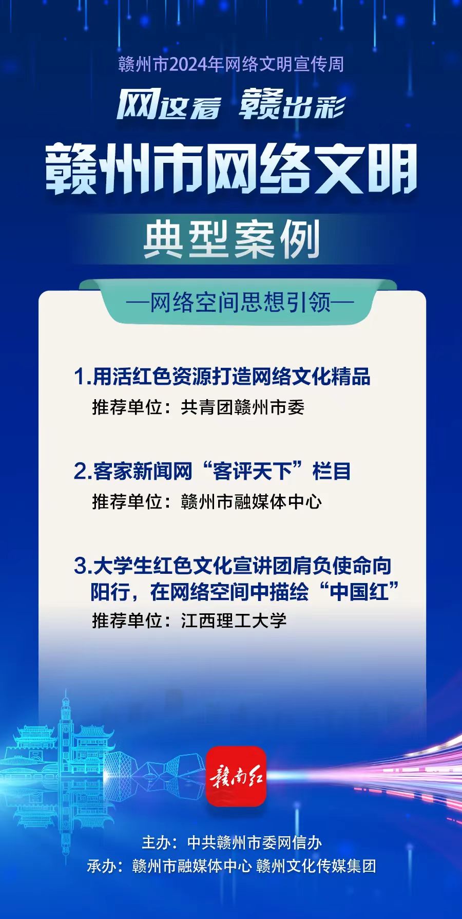 据悉,2024年赣州市2024年网络盛典暨网络文明宣传周活动主题为“网这看 赣出彩”,现场揭晓了赣州市网络文明6大类18个典型案例,活动旨在营造主旋律高昂、正能量强劲、崇德向善的网络空间。